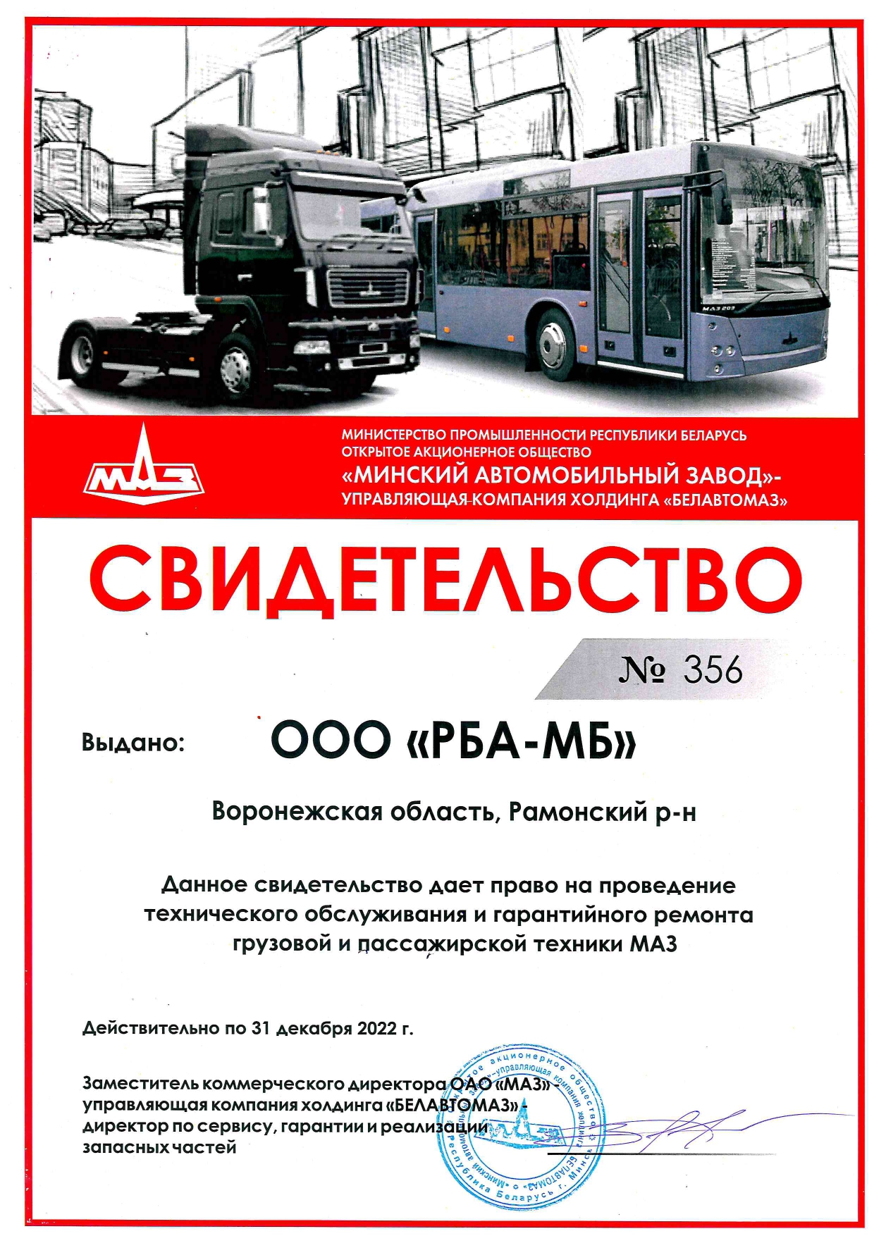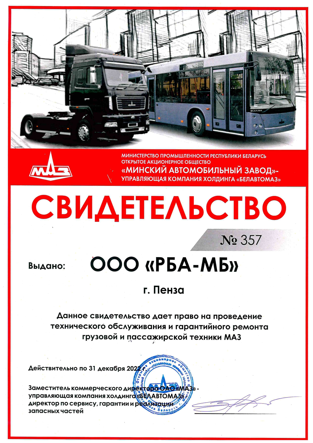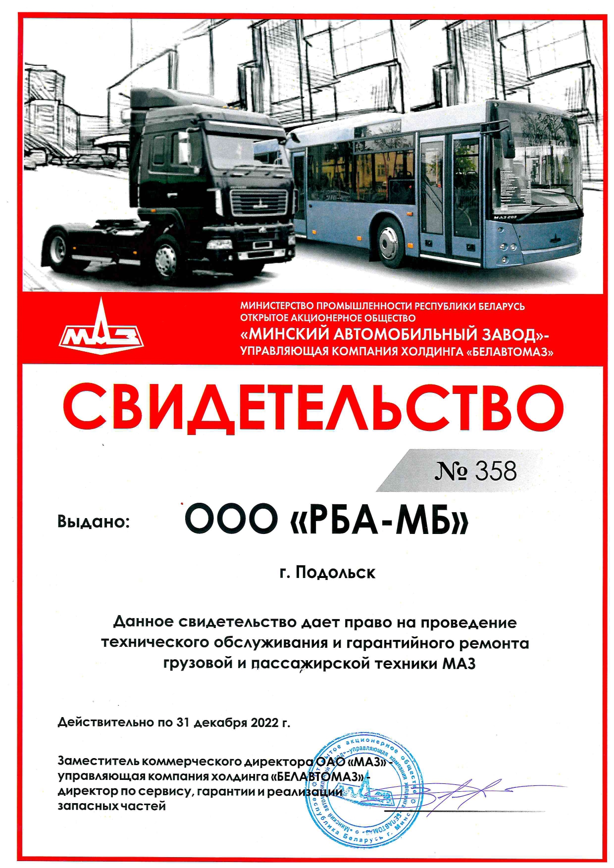 Гарантийный срок на автомобили МАЗ варьируются в зависимости от модели. Компания «Русбизнесавто» осуществляет плановое техническое обслуживание МАЗ на собственных СТО, оснащённых по всем стандартам производителя, а также ремонтирует технику после истечения гарантийного срока.