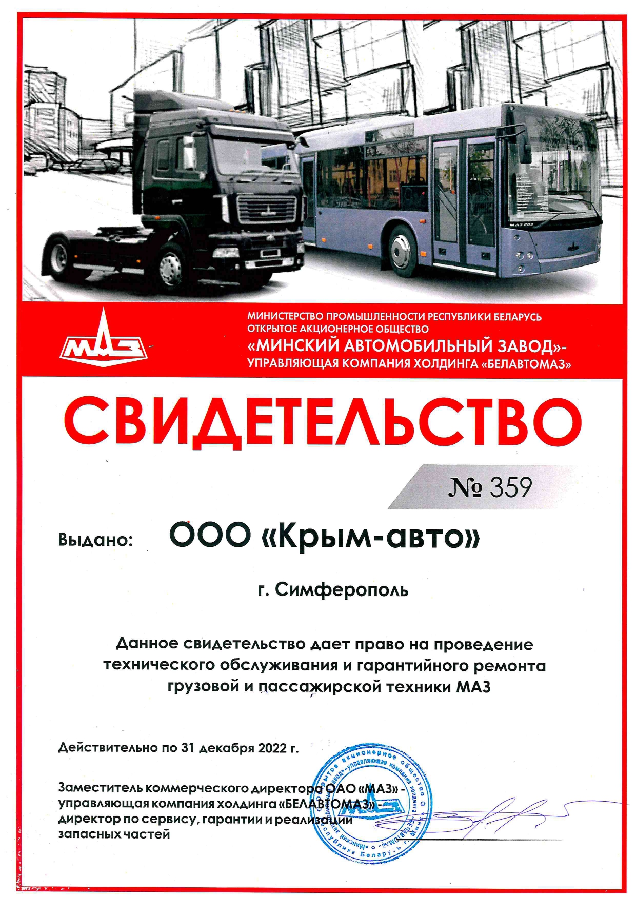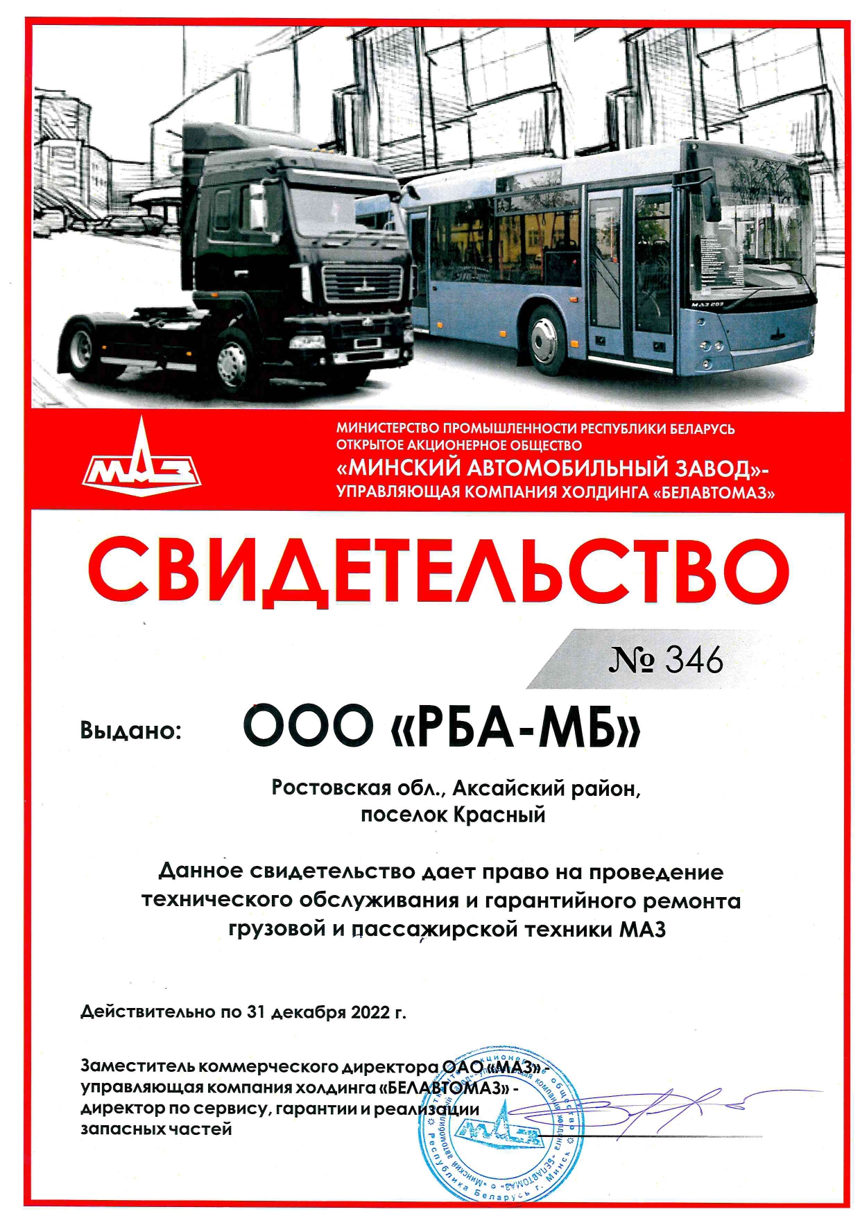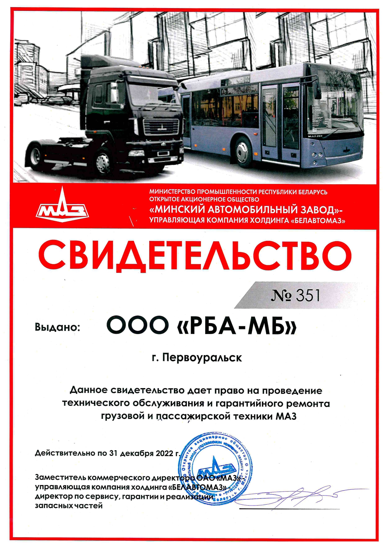 Гарантийный срок на автомобили МАЗ варьируются в зависимости от модели. Компания «Русбизнесавто» осуществляет плановое техническое обслуживание МАЗ на собственных СТО, оснащённых по всем стандартам производителя, а также ремонтирует технику после истечения гарантийного срока.