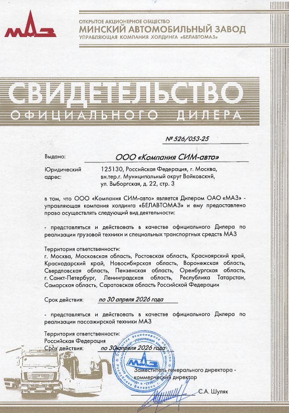 Покупая технику у официального дилера МАЗ в России в компании «Русбизнесавто», Вы получаете возможность воспользоваться выгодными программами финансирования. Дополнительную информацию можно получить у наших менеджеров.