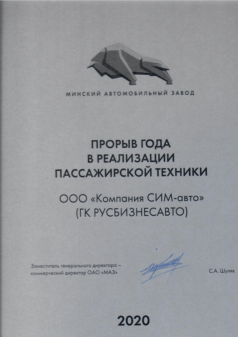 За годы работы компания «Русбзнесавто» была неоднократно отмечена заводом МАЗ. Например, в 2020 году мы были признаны лучшим дилером этой марки, а также получили отдельную награду «Прорыв года в реализации пассажирской техники» за хорошую динамику роста продажи автобусов. По результатам 2021 года мы сохранили лидерство.