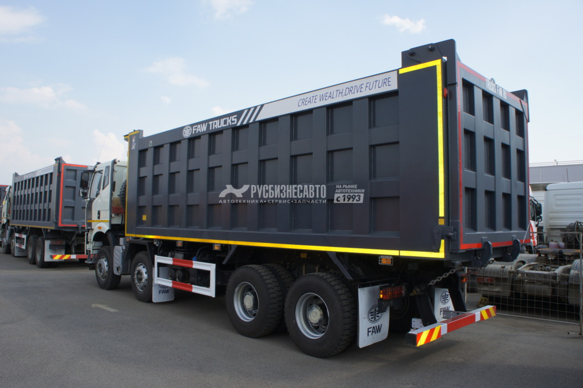 Самосвал FAW 8х4 с П-образным кузовом и максимальным углом подъёма 52 градуса подходит для использования на предприятиях жилищно-коммунального и сельского хозяйства, строительных площадках. Это функциональная техника со значительным рабочим ресурсом и высокой ремонтопригодностью. Кузов сделан из стали K450, толщина стенки — 5 мм.