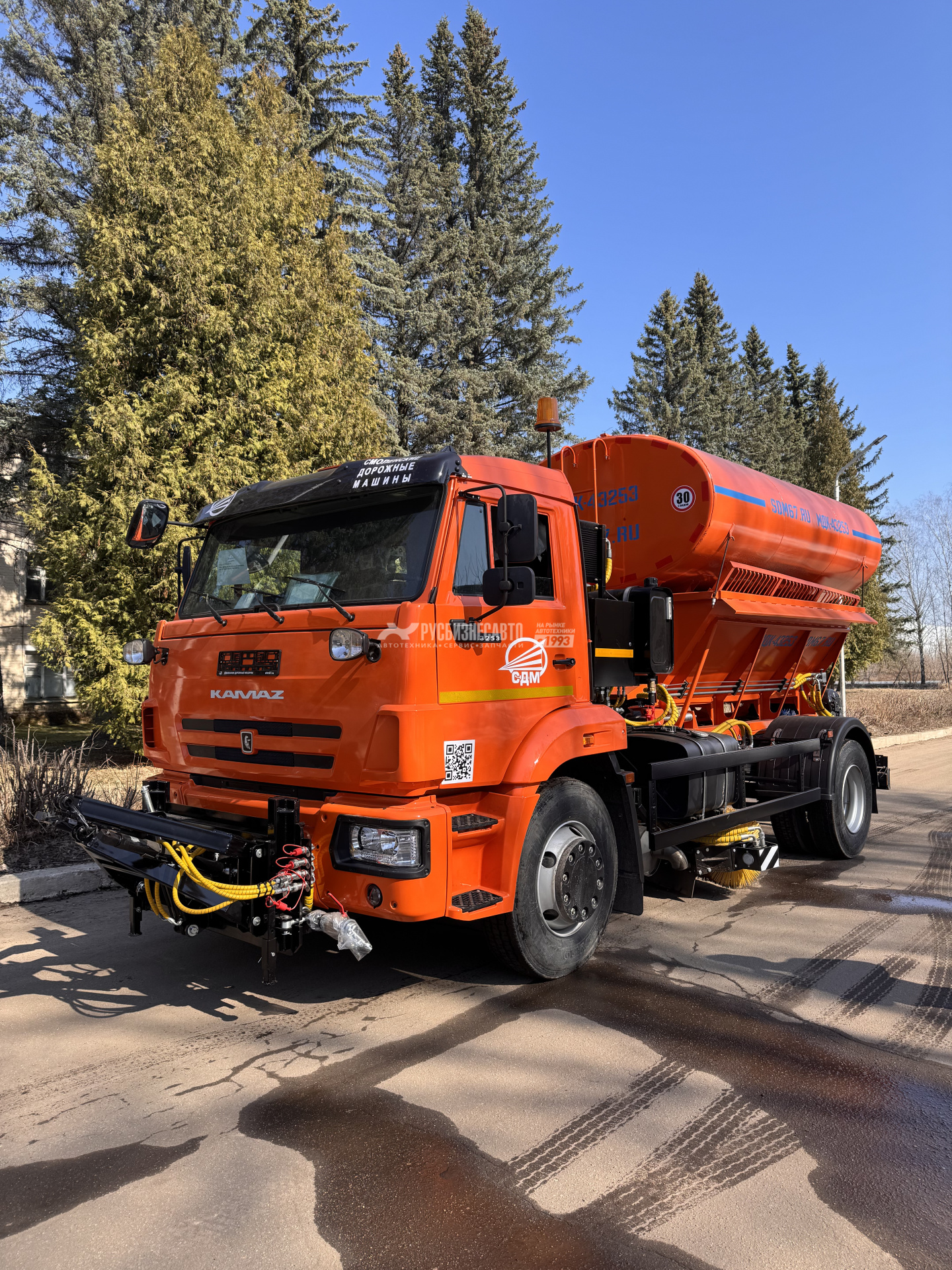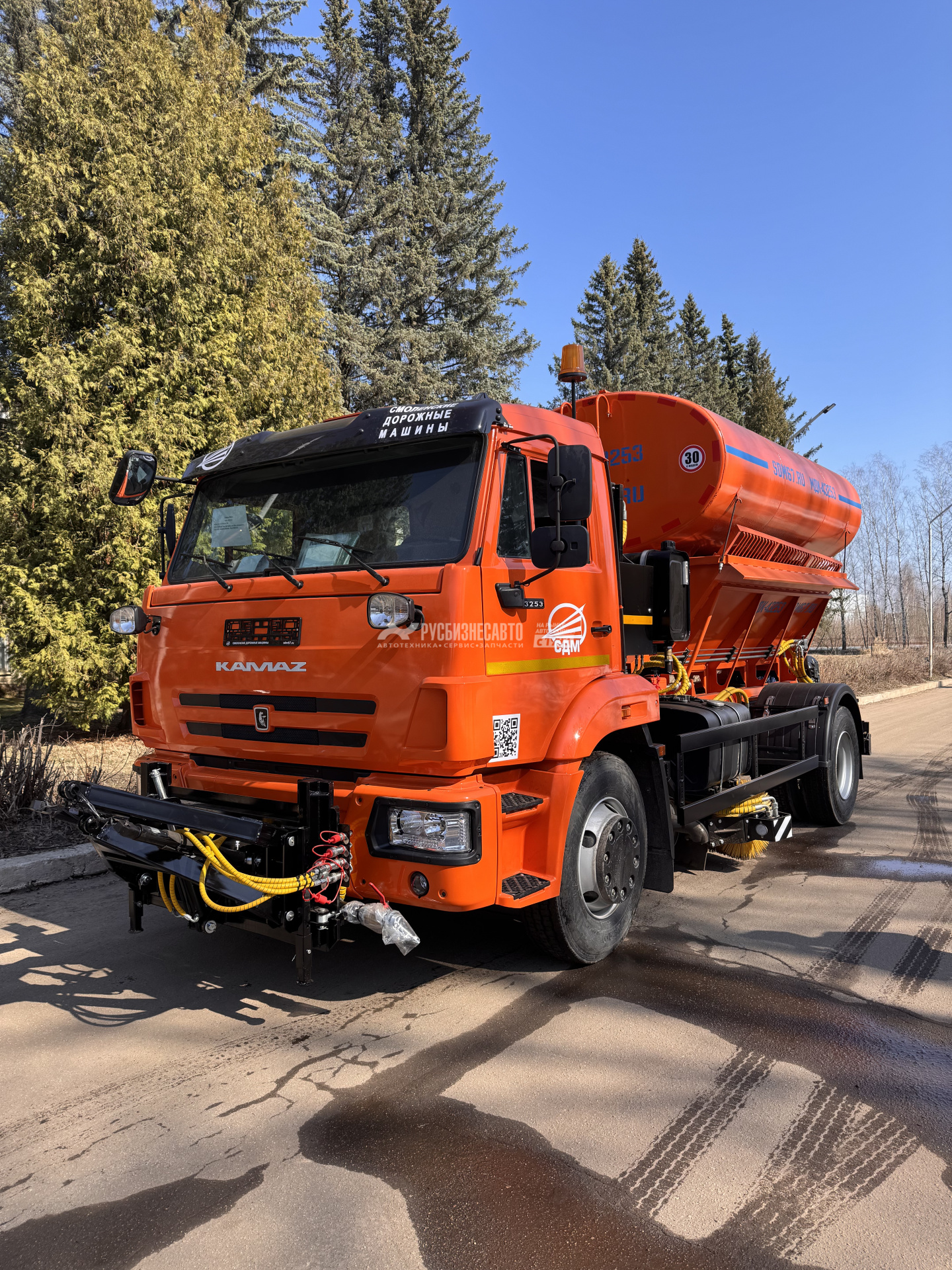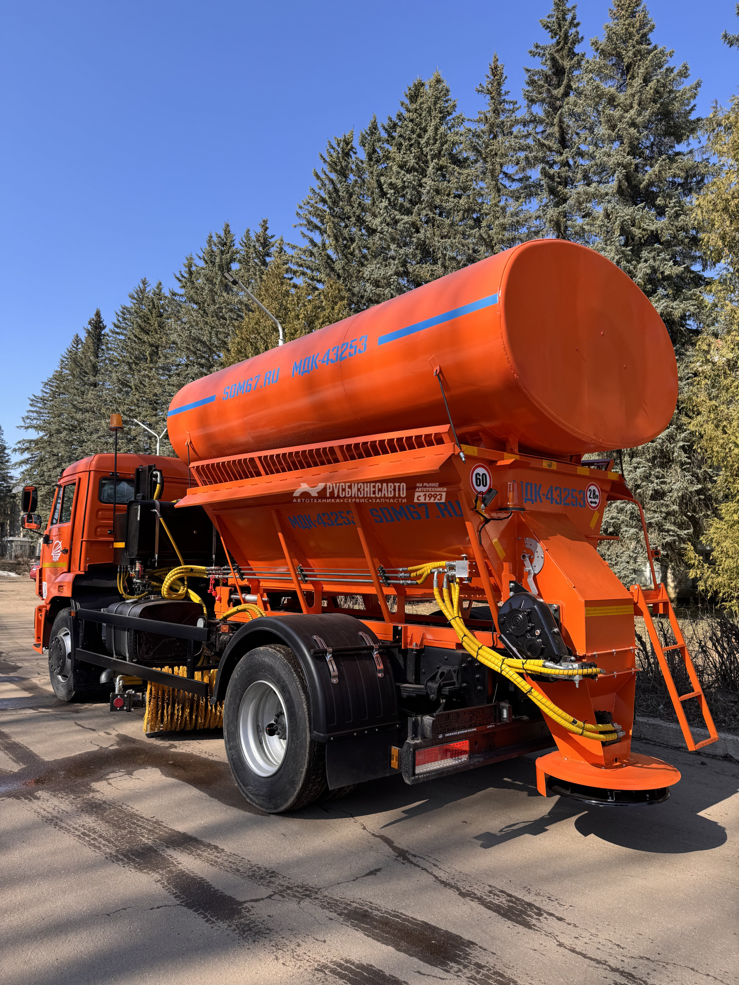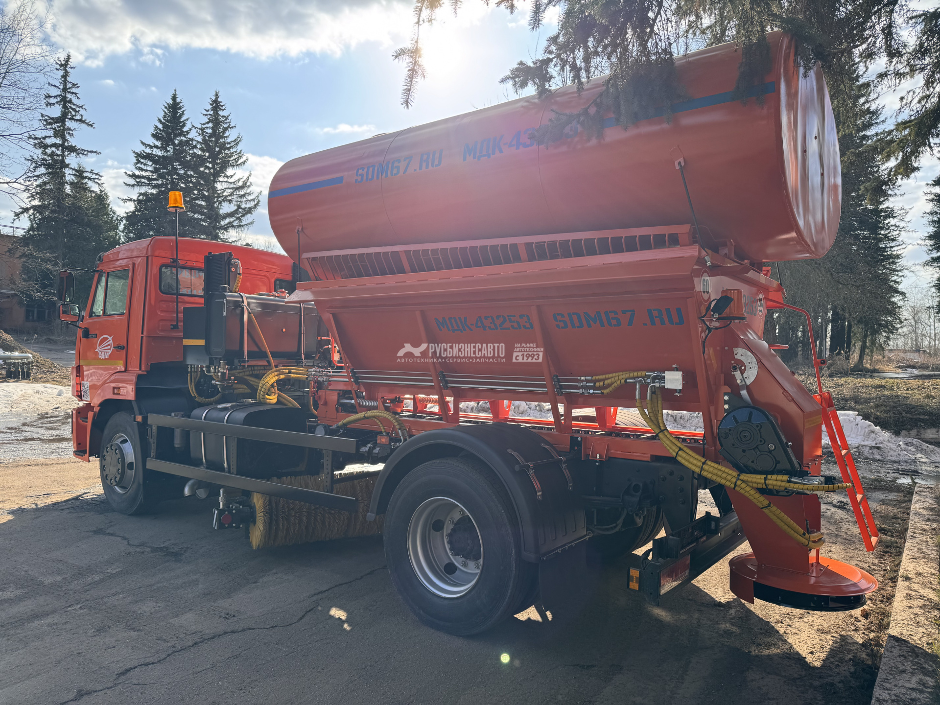 - Клапан by-pass (сохранность КПП; увеличенный КПД; улучшенную управляемость ТС во время работы с навесным оборудованием; увеличеный срок службы автомобиля; повышенную безопасность дорожного движения). - Необслуживаемый транспортер с двумя тяговыми конвейерными, безвтулочными цепями и приварными пластинчатыми скребками. - Средняя подметальная щетка 2,34 м. с гидроприводом без промежуточных цепных передач. - Гидрораспределитель с электро-пневмо управлением и ручным дублированием. - Гиравлический привод водяного насоса. - Дополнительный гидроклапан в магистрале пескоразбрасывающего оборудования для плавного включения транспортера (сохраняет от разрыва цепи). - Разбрасывающий диск вогнутой формы для равномерного распределения ПСС - Коническо-цилиндрический редуктор Berma RT 500. - Кузов бункера объемом 5 куб/м. - Плужное оборудование с гидроповоротным отвалом 3 м. - Быстросъемное поливомоечное оборудование с напорными соплами. - БРС.